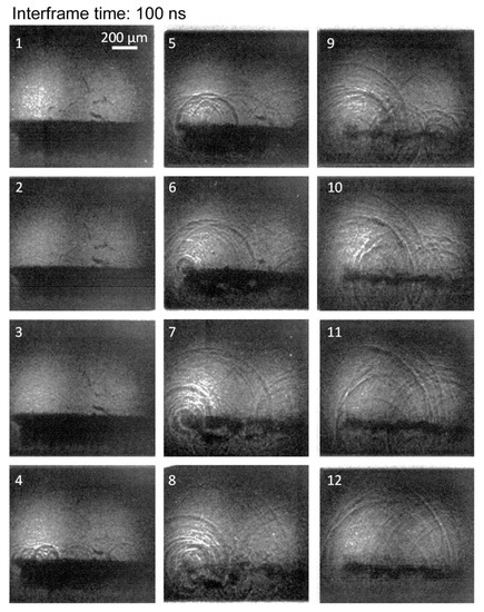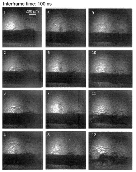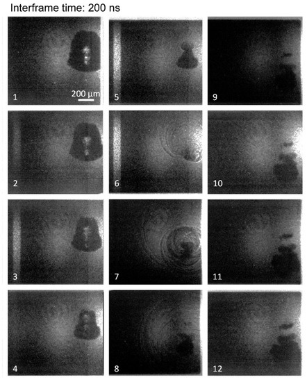 The high-speed videos showed that multiple shock waves are formed during the collapse of these large toroidal bubbles. However, the cause of the formation of multiple shock waves differs from the two cases presented before, i.e., no water hammer shock waves have been observed. Figure 7 shows that several shock waves form at different times along the whole torus. The first shock waves are formed in photo 1. New shock waves are continuously forming until photo 12, a duration of 1.1 µs. Therefore, the number of shock waves and the interval of time during which the shocks are generated is larger than in the case of a quasi-spherical bubble.