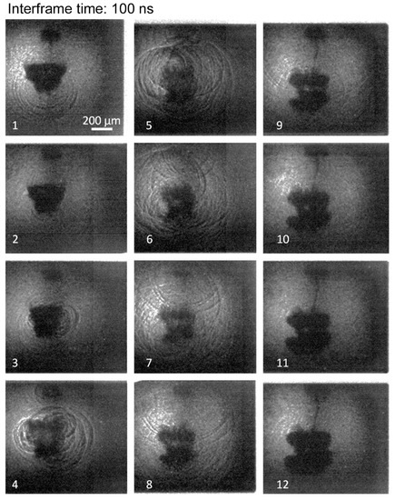 The bubble is observed with a high-speed camera (Ultra Neo, NAC), capable of capturing 12 successive images at a maximum rate of 200 million frames per second, each photo having a resolution of 1082 × 974 pixels. The exposure time for each photo can be reduced to a minimum of 5 ns. A microscope zoom lens (VH-Z50L, Keyence, Osaka City, Japan) is mounted on the camera in order to magnify the image by up to 500 times. This lens has a long working distance of 85 mm among different magnifications which allows it to observe a small 1.22 × 0.90 mm area in a container. The lens mount adapters of Keyence-mount to C-mount and C-mount to F-mount were used for connecting between the camera and the lens. A continuous wave laser source of 1 W at maximum and 1.5 mm in diameter (SDL-532-1000TL, Shanghai Dream Lasers) is used to illuminate the bubble from the back (see Figure 1). The short exposure time of 5 ns and the collimated beam provided by the continuous wave laser with an averaged light intensity of 0.56 W/mm2 at 532 nm allow the shock waves to be visible on the high-speed video. The spatial resolution of the photo is 1.1 µm/pixel so that the shock wave thickness of 7.5 µm (7 pixels) can be clearly imaged. The videos presented in this paper are taken at 5 or 10 million frames per second, with a magnification of 300 times.