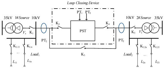 How to realize the loop closing non-stop transfer of supply has become a hot research topic, but the grid often does not meet the loop closing conditions in actual operation, so efficient and safe non-stop load transfer requires the study of new loop closing device technology. Ye Q et al. [24] controlled system currents by adjusting transformer taps and using reactive power compensation, but could not adjust the phase difference between voltages, making it difficult to achieve long-term stable loop closing operation of multiple power sources. Zhang Z et al. [25] proposed a control strategy to optimize the loop closing currents by applying a unified tide controller, taking into account the distribution network loss and node voltage deviation. Li S et al. [26] proposed to find the two nodes with the minimum voltage difference as the optimal closing point in the distribution network by using merit search, but the ring network location and operation mode are changed, and the distribution network structure will be changed as a result. Zhao C et al. [27] analyzed the countermeasures to reduce the closing current during the closing operation, and developed the corresponding closing operation means with less impact on relay protection measures. Chen G et al. [28] analyzed the risks of low-voltage loop closing and the causes of loop closing currents through simulation and proposed operational suggestions for loop closing and power transfer to ensure the safety and reliability of low-voltage loop closing operation, which provided some theoretical and technical support for low-voltage loop closing to realize non-stop power transfer. PST is mainly used for voltage phase regulation by changing the tap, and the PST technology is relatively mature and relatively easy to operate and maintain [29], so it is considered to be applied as a loop closing device for loop closing transfer. The application scenario of PST as a loop closing device is shown in Figure 1.