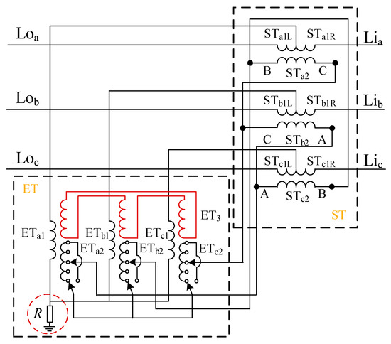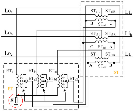 Distribution system substations are generally wired according to Yd, a 10 kV voltage level distribution network is generally angle type wiring and there is usually no neutral point. A cable distribution network, in order to use the neutral point through a small resistance grounding method in the angled side to introduce the neutral point, usually uses grounding transformers to introduce an artificial neutral point. A grounding transformer has the advantages of high excitation impedance and a small no-load loss during the normal operation of the system, and small zero-sequence impedance and large positive and negative sequence impedance when a single-phase fault occurs. Since the ET winding of the excitation transformer of the PST is wired according to Yy and its ET primary is connected in series with the 10 kV bus through its ST primary, a slight improvement from the structure of Figure 2 can form a neutral point and construct a PSGT, whose structure is shown in Figure 3.