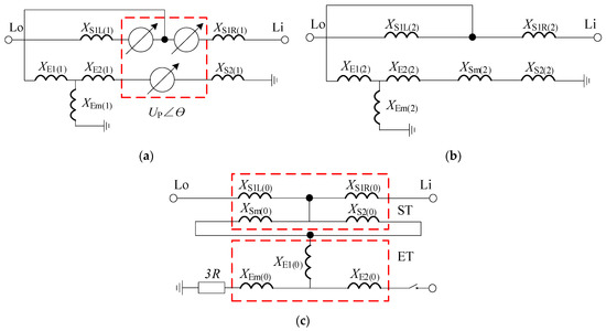 where XP(0) is the PSGT zero-sequence equivalent reactance when the ground fault occurs on the Lo side, XS1x(0) = XS1L(0), and XS1x(0) = XS1R(0) when the ground fault occurs on the Li side. The ST zero sequence excitation reactance XSm(0) and ET zero sequence excitation reactance XEm(0) have large values in non-three-phase three-column transformers and are approximated as open excitation branch circuits.