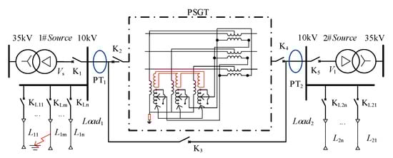 Based on the structural form and operation mode characteristics of China’s distribution network, the non-stop load reversal through the loop operation can reduce the outage time, improve the reliability of power supply, ensure the quality of system power supply, and improve the public satisfaction of power services [13,14]. The phase-shifting transformer (PST) based loop closing device has the characteristics of a flexible and wide range of regulation, outstanding cost advantage, and easy operation and maintenance [15], but it is mainly put into the distribution network system for the function of loop closing transfer. Combining the structural characteristics of Y-type wiring on the primary side of PST and the grounding transformer and small resistance connection, this paper proposed a phase-shifting and grounding transformer (PSGT) device with a neutral point grounded by small resistance. Based on the original structure and functions of PST, the PSGT with small resistance grounding at a neutral point can not only realize the phase-shifting function required for the loop to supply, but also solve the arc-earth overvoltage problem and improve the power supply reliability of the distribution system mainly for cable lines.