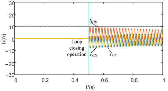 The PSCAD/EMTDC environment is used to build a distribution system simulation model of a PSGT as a loop closing device using inbuilt components. The initial state is 10∠30° kV for bus 1# and 10∠0° kV for bus 2#. The whole simulation time is set to 2.1 s, with switches K1, K4, and K5 closed and switches K2 and K3 open. The current flowing through K2 at this time is shown in Figure 9.