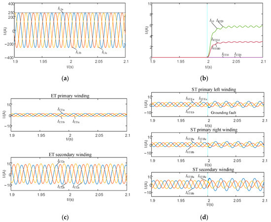 Where IET3 is the secondary angular winding current added to the excitation transformer. From the analysis of Figure 11a, it can be seen that when the access to the PSGT occurs at 2 s with a single-phase fault short circuit in phase A, the phase current of phase A changes abruptly to 1000 A, which is four times the phase current in normal operation or without access to the PSGT. Combined with the analysis of the zero-sequence current situation in Figure 11b, it can be seen that the zero-sequence currents of each winding of the PSGT-based loop closing device are also equal, and there are two orders of magnitude changes in the zero sequence currents at this time compared with Figure 10b, indicating that the PSGT can effectively identify faults and handle them accurately. From Figure 11c,d, it can be seen that the phase currents of each winding involved in the zero-sequence loop of the PSGT-based loop closing device are subject to sudden changes, but the three-phase currents of each winding are equal at this time.