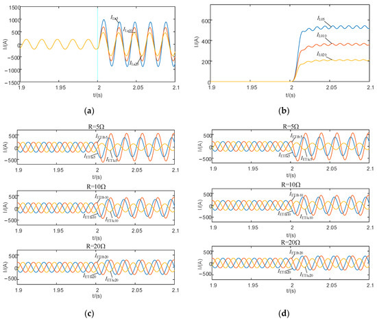 This is based on a different ground resistance PSGT and fault line current. (a) Bus 1# fault phase current; (b) Zero sequence current of the faulty line; (c) ET primary winding three-phase current; (d) ST primary winding three-phase current.