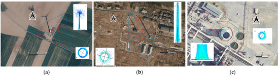 Positions of the measurement locations around the objects together with the local coordinate system: (a) cooling tower, (b) smokestack, (c) wind turbine tower. (1) Scan of the object—side view, (2) local coordinate system–top view. Blue lines–control network, observation range, and total station positions; red lines–control network, observation range, and laser positions. Image in the background—orthophotomap from the Geoportal web service (https://mapy.geoportal.gov.pl/ accessed on 15 November 2021).