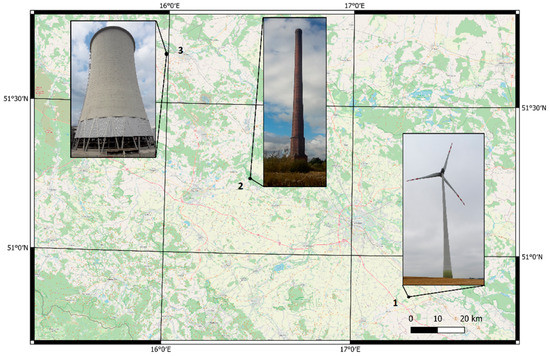 Location of the surveyed objects on the map: (1) wind turbine, (2) smokestack, and (3) cooling tower. Map in the background: Open Street Map (http://www.openstreetmap.org, accessed on 23 November 2021).