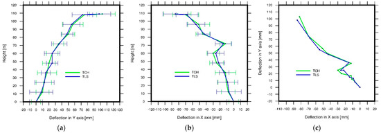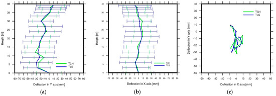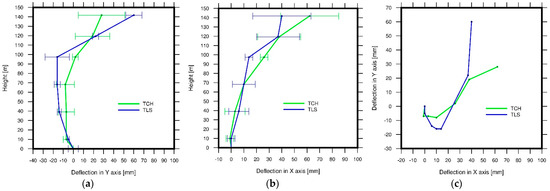 Deflection graphs of the industrial smokestack: (a) in the YZ axis, (b) in the XZ axis, and (c) in the XY axis. In XZ and YZ, axis vectors are depicted with an error bar in millimeters.