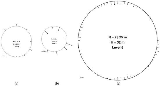 Horizontal displacements are measured by determining the changes of the object location on a horizontal plane along two axes and by fitting the point distribution on the surface to the theoretical shape. Horizontal displacement analysis is performed in horizontal cross-sections, calculated for different levels of the object. Depending on the height, complexity, and construction technology, the number of such levels can vary from several to several dozen. Objects, such as wind turbine towers and smokestacks, have a regular shape and therefore the measurement levels do not need to be arranged with a great density, because such a TCH survey would require a lot of time in constant external (atmospheric) conditions. Cooling towers have a more complicated shape, and therefore need to be measured on more levels. During a TCH measurement, in which the surveyor aims at a certain point on the object, the number of measurement levels should be possibly limited. Such limitations are not present in the TLS method, as the measurement is much quicker and covers the entire height and width of the object. The measurement levels are defined with an accuracy of 2–3 cm, which is sufficient to ensure that the calculations are correct. Figure 1 shows the distribution of the measurement levels.