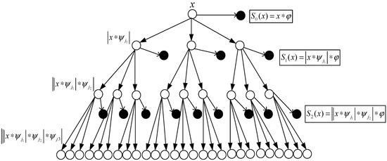 where refers to the low pass filter, so refers to a local translation invariant descriptor of the signal , the scattering coefficients, and the input signal with translation invariance, extracting the low-frequency information of the input signal and removing all high-frequency information. represents a high-frequency wavelet. High-frequency information is recovered by the modulus transformation , which represents the high-frequency information on scale and obtains deformation stability by module operation on the nonlinear wavelet transform. Therefore, the low-frequency information (scattering coefficients) and high-frequency information of the wavelet scattering transformation of order 0 are as follows: