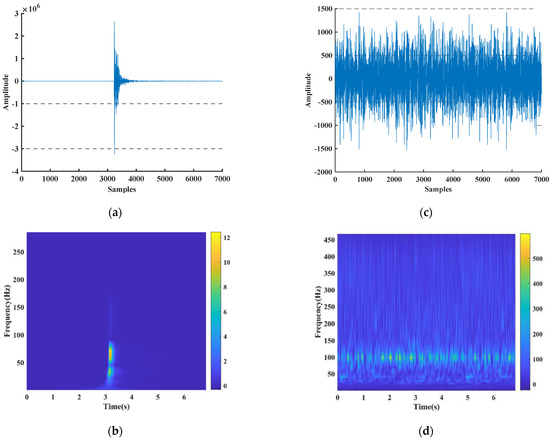 (a) microseismic signal, (b) scattergram time-frequency analysis of (a). (c) noise signal, (d) scattergram time-frequency analysis of (c).