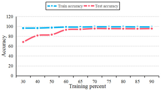 To achieve better performance in the defined WSD-SVM model, 70 percent of the data in each class were randomly devoted to the formation of the training set STr which was trained in order to obtain the SVM classifier. Meanwhile, the remaining 30 percent was withheld for testing and assigned to the test set STe. As is known, the performance of a supervised machine learning algorithm is largely dependent on the training percent of the data set. The above process was repeated with different training percents, and the corresponding classification accuracy rates were calculated as shown in Figure 6.