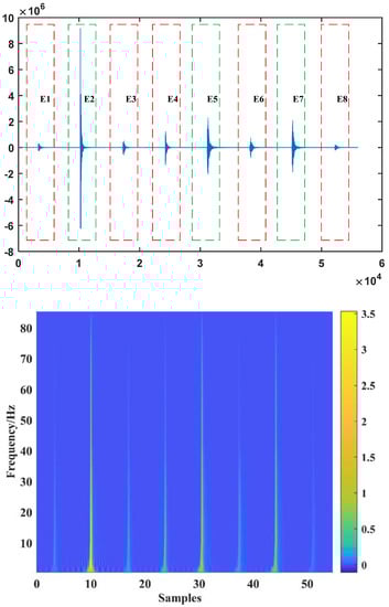 We sought to verify the validity of the above algorithm, so a continuous microseismic signal with a duration of 56 s was selected for the experiment. Data were obtained using the monitoring equipment installed in a coal mine in northwestern China; results are shown in Figure 7.