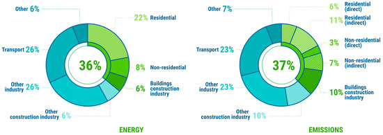 According to the United Nations Environment Programme report for 2021 [1], the operation of the buildings and construction industry in 2020 generated around 37% (11.7 gigatons) of global energy-related carbon dioxide emissions and consumed 149 exajoules or 36% of global energy (Figure 1). In 2015, this sector was responsible for 38% (13.1 gigatons) of CO2 emissions and required 144 exajoules of energy. Energy demand peaked at 150 exajoules in 2019. The slowdown in global energy demand for the operation of the buildings and construction industry and the reduction in emissions reflect the impact of the COVID-19 pandemic. Thus, the ascent of construction projects postponed due to pandemics can be expected in the post-pandemic era. Therefore, energy demand will increase and environmental problems, often related to the construction sector, may arise.