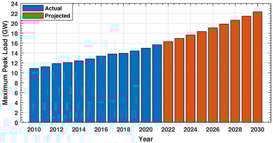 Kuwait is located between 28 and 31 N and longitudes 46 and 49 E and extends over area of 17,818 km [28]. The climate is characterized by two main seasons, a dry and hot summer and a short—relatively warm—winter [29]. Electricity peak demand in Kuwait has significantly increased from 10.9 GW in 2010 to 15.7 GW in 2021, and is projected to increase to over 22 GW by 2030 at an annual rate of 4% [30,31,32]. Figure 1 illustrates the actual and projected maximum peak load in the period from 2010–2030. Kuwait’s energy needs are fulfilled through fossil-fuel-dependent (e.g., oil and natural gas) power plants, making them responsible for 95% of the country’s total CO emissions. Not only that, an annual per capita CO equivalent to 21.6 tonnes makes Kuwait higher than the average of the world [33]. Currently, many new cities and residential areas are being built in Kuwait to meet the housing crisis [34], which will exacerbate the energy demands. Thus, reliance on non-renewable resources presents a challenge in the future.