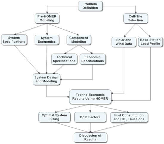 Based on the problem definition, an off-grid HPWES must be designed to meet the BS load demand at each cell-site. This entails two main tasks: (1) cell-site selection and (2) Pre-HOMER modeling, which are then amalgamated to determine the optimal HPWES system design and performance criteria. For the first task, two BS cell-sites with different solar and wind data characteristics must be carefully selected, along with their AC/DC BS load profiles. On the other hand, and to realistically model the HPWES (i.e., in the Pre-HOMER modeling task), the system specifications (e.g., technical constraints), system economics (i.e., cost model and project lifetime), and component technical and economic specifications must be defined. This is followed by system design and modeling for various system configurations (based on PV panels, WTs, DG, and batteries). After that, the system design along with the BS load profile as well as the solar/wind data at each cell-site are incorporated into HOMER to obtain the techno-economic results. Specifically, the optimal system sizing, cost factors, and resulting fuel consumption and CO emissions are obtained. Lastly, a detailed discussion of results will be presented, and conclusions will be drawn. The considered workflow is demonstrated in Figure 2.