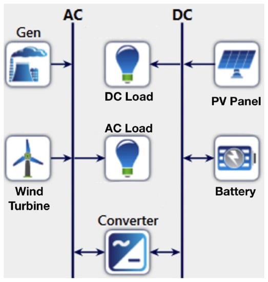 - Converter: Various types of converters are used to convert the DC voltage from the PV panels and battery into usable AC voltage, and the AC voltage from the WTs and DG into DC voltage. Moreover, the DC/DC converter is used to convert a DC voltage from one level to another.