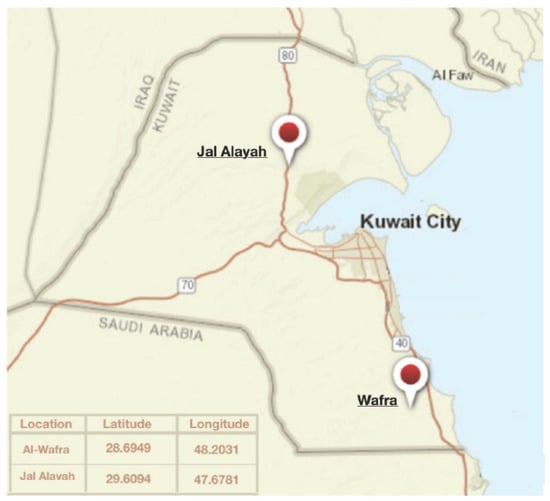 Two cell-site locations are considered in this work to gain insights into the potentials of solar and wind energy in the rural areas of Kuwait. Specifically, cell-sites at (1) Jal-Alayah and (2) Wafra are considered, as shown in Figure 5. The Jal-Alayah cell-site is located North West the capital city of Kuwait (longitude 47.678 E and latitude 29.609 N), while the Wafra cell-site is located south of the capital city of Kuwait (longitude 48.203 E and latitude 28.695 N).