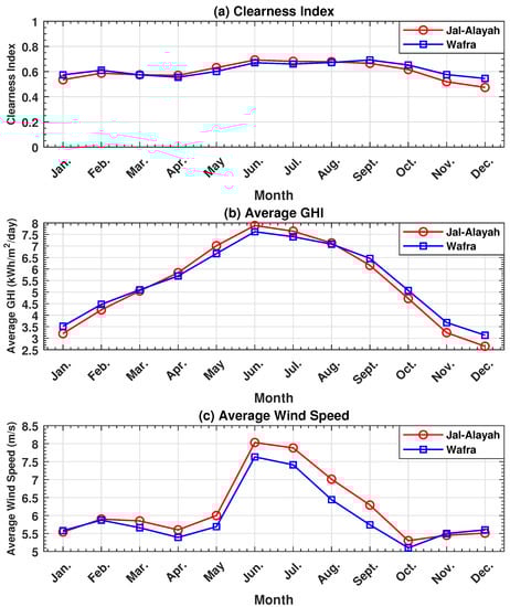 in which is the wind speed at height h above ground “reference” level . Moreover, is the the surface roughness factor, and is usually set as for Kuwait [64]. At an anemometer height of 10 m, the wind speed in Jal-Alayah and Wafra cell-sites have been calculated as 4.93 m/s and 4.74 m/s, respectively. Accordingly, the shape factors are set to 2.24 and 2.09 for Jal-Alayah and Wafra, respectively. In the simulations, the height above sea level in Jal-Alayah and Wafra cell-sites have been found as 110 m and 38 m, respectively [65]. Thus, the average wind speeds for Jal-Alayah and Wafra cell-sites have been adjusted as per (3), yielding 6.20 m/s and 5.97 m/s, respectively. Figure 6 illustrates the monthly average clearness index, GHI, and wind speed at Jal-Alayah and Wafra cell-sites, while Table 1 summarizes the average annual temperature, clearness index, GHI and wind speed data at Jal-Alayah and Wafra cell-sites, which have been obtained from the POWER database [40]. It should be noted that the NASA POWER database encompasses solar, wind, and meteorological data collected, updated, and averaged over 40 years [66,67]. This serves to ensure that the results obtained in this work are statistically valid and realistically coincide with practical systems.