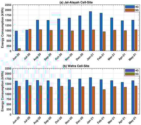 The BS load profiles of the Jal-Alayah and Wafra cell-sites have been obtained from mobile operator Zain, which is a leading mobile service provider in Kuwait and the Middle East [48]. The monthly DC load profiles for both cell-sites are depicted in Figure 7 for the period between June 2020 and May 2021. A summary of the load profiles is given in Table 2, where it can be seen that the Wafra cell-site consumes more power than the Jal-Alayah cell-site, which is due to the fact that Wafra encompasses farms and is surrounded by newly constructed residential buildings. The BSs at both cell-sites operate both 4G and 5G technologies, and they are configured as shown in Table 3.
