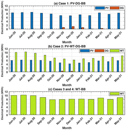 Particularly, in HOMER, the above system configurations will be optimized to meet the BS load demand while simultaneously minimizing the NPC. In the system configurations, two PV panels and two WTs are compared (i.e., a total of four cases per cell-site). Specifically, the PV panels are [58,59]: