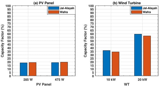 From Table 1, it can be seen that the Wafra cell-site enjoys slightly higher average clearness index and GHI than Jal-Alayah cell-site, and thus is expected to have higher potential when using PV panels. Contrarily, the Jal-Alayah cell-site has higher average wind speed (and wind potential) than the Wafra cell-site and thus is expected to have higher potential for WTs.