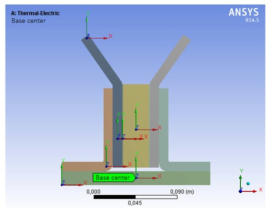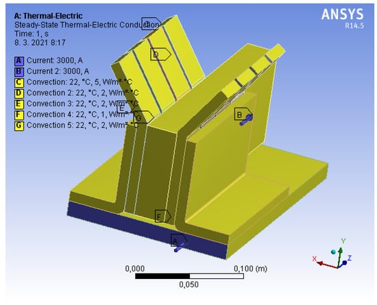 In Figure 3, the direct contact with the set values of thermal convections and electric current is visible. Convection (heat flow) is one of the ways of spreading heat in liquids and gases. In ANSYS, however, it represents the so-called heat surface losses. This parameter allows, when modeling, taking into account the way of storing a certain object, such as vertical or horizontal mounting.
