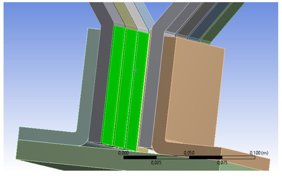 The temperature distribution was studied by adding a volume of 1 mm width to all contact points. As a result of the negative effect of the environment, aging of the material, etc., this volume displays slight wear, unevenness, and particularly oxidation of the contacts. Although impurities of this kind are much thinner, of the order of 10−4 mm, due to some imperfections in the program, there is a possibility of errors in the formation of crosslinks on the impurities. These impurities are highlighted in green on Figure 4.