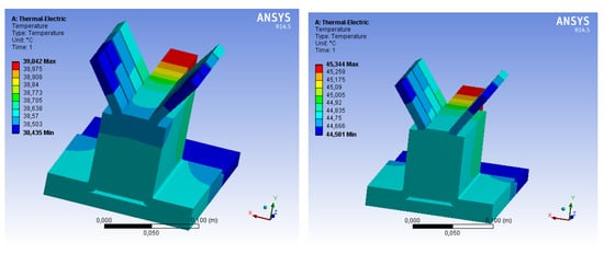 The temperature distribution in Figure 5 (left) shows that the highest temperature occurred at the beginning of the contact knife, with 39.042 °C being the maximum value. In the middle of the base in the area above the contact holders is the lowest temperature, but also the lowest temperature value reaches 38.435 °C at the ends of the contacts at the end of the knife.