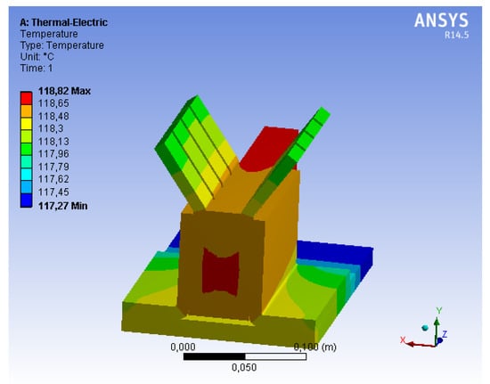 In the current example, the maximum temperature is 118.82 °C, and the minimum is 117.27 °C. This represents a two-fold increase in temperature compared to the first two cases. Comparing the operating states with the previous “real” and “ideal” states, the “real” operating state had a higher maximum temperature by 73.476 °C and the “ideal” operating state had a higher maximum temperature by 79.778 °C.