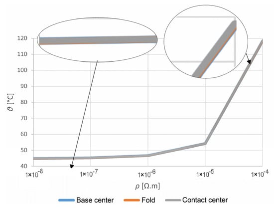 By creating deteriorating electrical conductivity within this range of resistivity, we produced contamination between the contacts and the contact knife. Small impurities were represented by 1 × 10−8 Ω⋅m, and very large contamination areas were identified by 1 × 10−4 Ω⋅m. (Figure 5, right) shows a contact with a resistivity of 1 × 10−8 Ω⋅m. We presumed this value indicates the actual operating state at the time of initial commissioning.