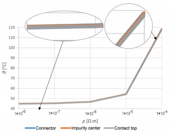 Figure 8 and Figure 9 clearly show a non-linear increase in temperature with the increase in impurity resistivity. The temperature increased a small amount along the linear curve for impurities with resistivity values of 10−8 Ω⋅m and 10−6 Ω⋅m. A significant temperature change occurred from impurity resistivity of 10−6 Ω⋅m to 10−5 Ω⋅m, with the largest temperature change occurring between 10−5 Ω⋅m and value 10−4 Ω⋅m.