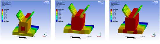 In our simulation, we considered free thermal convection, which is generated by gravity and has a vertical direction of heat transfer, meaning that heat is dissipated more readily from the upper part of an object than from its sides or lower part [30]. Based on these findings, we set the convection for the upper surfaces of direct contact to 5 W/(m2⋅°C), lateral 2 W/(m2⋅°C) and lower 1 W/(m2⋅°C).
