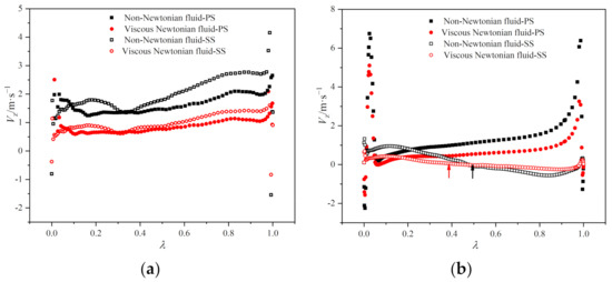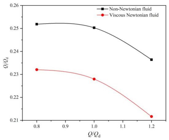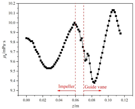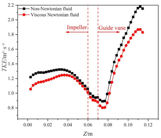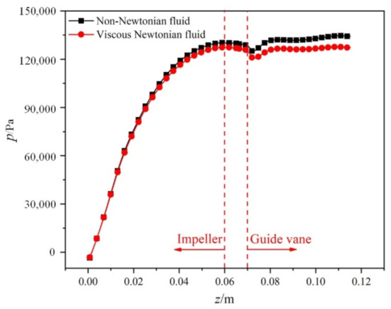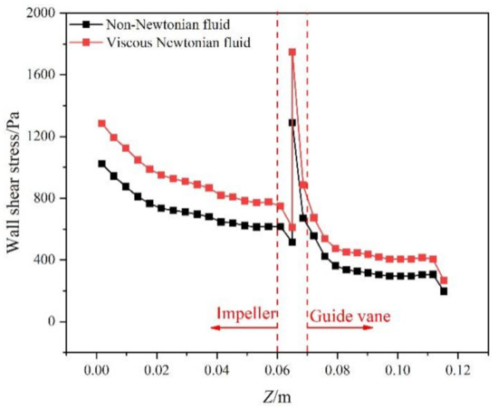 - For the shear-thinning non-Newtonian fluid, the reduction of apparent viscosity occurs mainly in the region of the impeller and guide vane inlets, vaneless area, guide vane outlet, and the near-wall region. In addition, a large velocity gradient is a common feature in these regions.