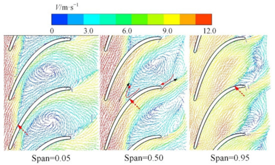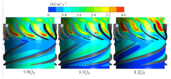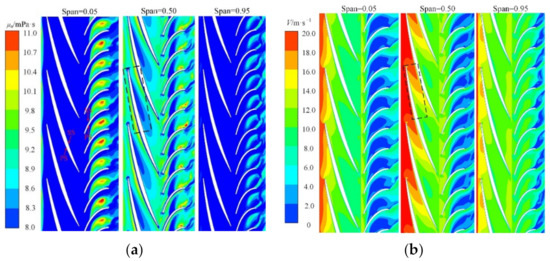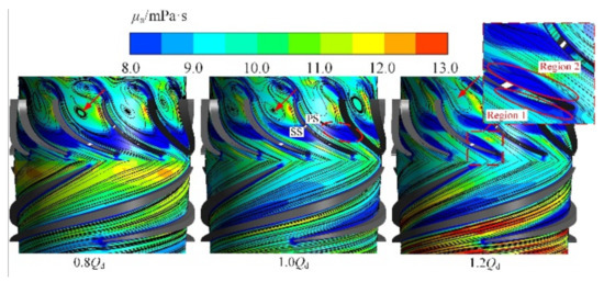 - As the flow rate increases, the low apparent viscosity area near the leading edge of the suction side gradually expands, which is caused by the intensified solution shock. Due to the intensified flow separation, the low apparent viscosity area in the pressure side also shows an increasing trend.