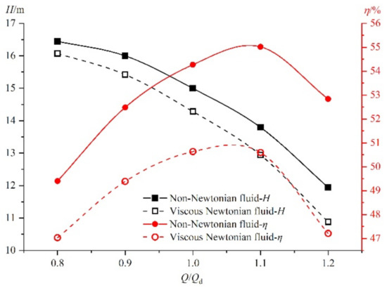 - Compared to the viscous Newtonian fluid, the pump head and efficiency could decrease sharply while the shear-thinning non-Newtonian fluid is handled. In addition, the reduction of efficiency is more obvious as the flow rate increases. It is noteworthy to mention that the shear-thinning properties lead to a relatively small flow rate range with high efficiency.
