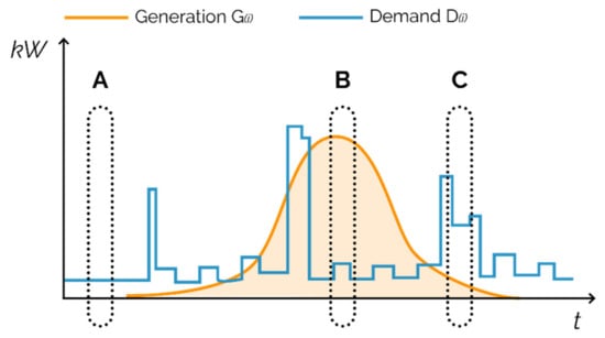 Conceptual graph of the variation of demand D (i) and generation G (i) in a prosumer dwelling during a day. Three possible situations are recognised. (A) G = 0, all electricity comes from the grid; (B) G > D, demanded energy comes from the on-site system and excess are feed into the grid; (C) D > G, all site generation is consumed on-site plus a surplus from the grid.