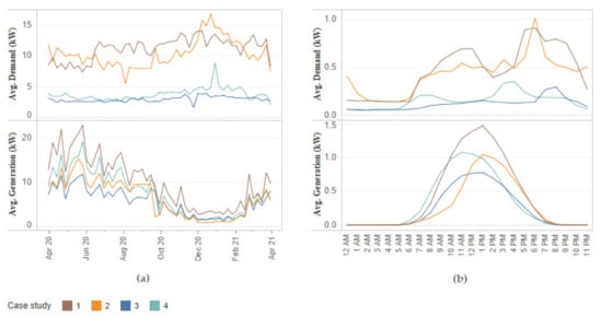 Yearly variation of weekly average daily totals (a) and average daily variation of hourly totals (b) of total electricity demand “D” (kW) and generation “G” (kW) for the 4 case studies. Dwellings 1 and 2 correspond to multiple occupancy, whereas 3 and 4 correspond to single residents. The aggregation period T is daily at the left-side diagrams and hourly at the right-side diagrams.