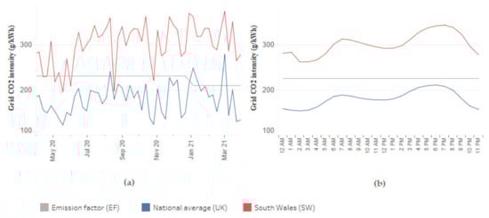 The grid’s carbon intensity API service uses CO2 g/kWh as its only metric and does not consider more comprehensive units such as CO2 eq [52,53]. For this reason, all calculations in this study were performed using kg of CO2 as the target unit. DEFRA’s EF of 231.04 g/kWh for 2020 and 210.16 g/kWh for 2021 [54] were considered as constants for the calculations.