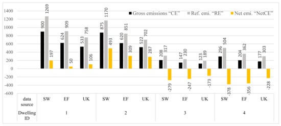Regarding gross emissions “CE”, the SW dataset produced the highest results across the four dwellings. The opposite happened with the UK dataset, which produced the lowest values across all dwellings. Variation across datasets was almost proportional regarding the gross emissions, with SW achieving between 41.1% and 45.1% more than EF in all cases, and the UK dataset achieving between −13.4% and −16.4%, respectively.