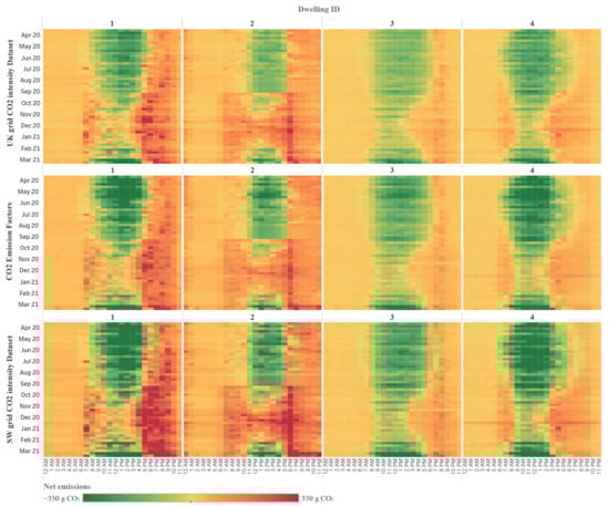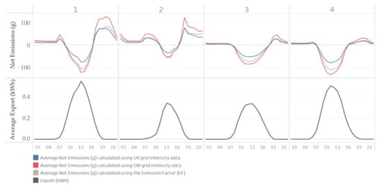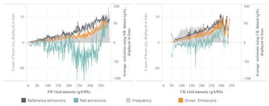 In this paper, DEFRA’s official national yearly ex post location-based average grid emission factor [54] (hereon simplified as the EF), national ex post half-hourly location-based average emission intensity [52] (hereon simplified as UK) and regional ex post half-hourly location-based average emission intensity [53] (hereon simplified as the SW) were used for the calculations.
