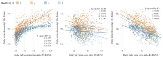 Four load-matching indicators were calculated to analyse whether their variations were associated with the variations in final carbon emissions. Two were associated with self-consumption, and two with daytime consumption.