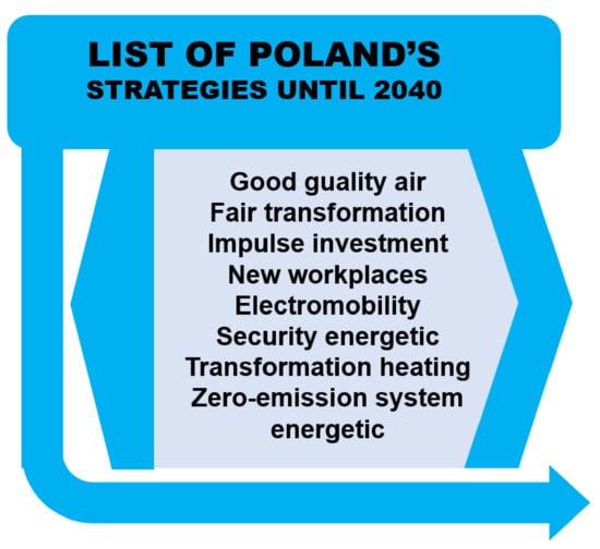 Poland’s Energy Policy until 2040 (PEP2040) [8] emphasizes a fair and inclusive energy transition toward a carbon-free system that is based on innovation, sustainable economic growth, increased efficiency and competition. The last key factor is improving air quality, which would solve a major nationwide problem [9,10,11].