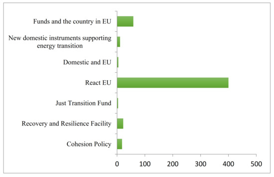 The feasibility of the assumed goals for the energy transformation is related to the financial strategy, for which EUR 200 billion has been allocated in the energy sector and EUR 167 billion in other industrial sectors [3]. The financial strategy until 2030 estimates the need for EU and national funds for climate policies (EUR 58.4 billion), including funds from: the EU Cohesion Policy; the Repair and Resilience Facility; the Just Transition Fund; REACT-EU; and other national and EU funds and new national instruments that support the energy transformation [4,5].