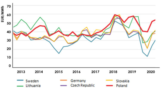 Electricity prices in Poland are much higher compared to the countries presented (2020), followed very closely by Lithuania and Slovakia. According to this list, the lowest prices are in Sweden.