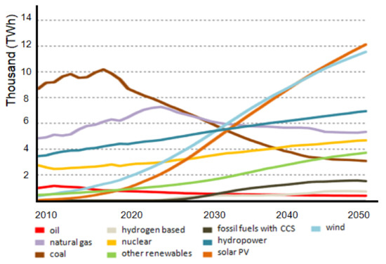 Global electricity production is estimated to almost double from about 30,000 to more than 50,000 TWh, which will become obvious in the next three decades assuming that the analysis of 2050 compared to 2020 is correct. Thanks to low-emission energy sources, we can see progressive growth. It is worth noting that the use of renewable energy sources in electricity generation may increase up to 70% by 2050. In Figure 10, we can note that photovoltaics and wind (50% of the electricity supply) compete with various other production sources. There is a noticeable increase in hydropower, which is estimated to become one of the leading electricity resources by 2050. Nuclear energy continues to grow due to China. Natural gas consumption appears to increase slightly while the contribution of coal to electricity production drops significantly by 2050. By around 2030, hydrogen and ammonia could be being used as fuel for generating electricity, along with natural gas in gas engines and coal.