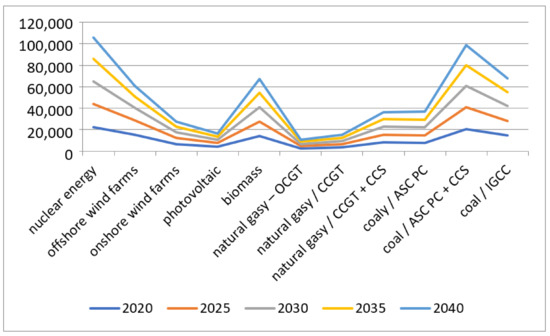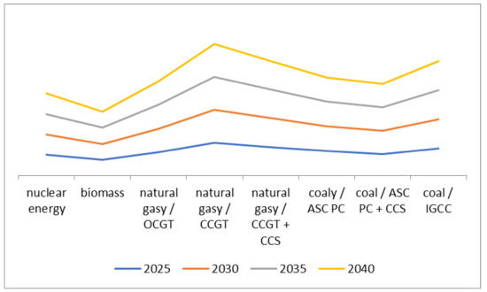The largest investments show a successive proportional increase from 2020 to 2040, according to Figure 13. With photovoltaics, we see a collapse of the index for biomass of over 60,000 and another decline for energy from open-cycle gas turbines (OCGT). We can successive growth for energy from combined-cycle gas turbines with carbon capture storage (CCGT + CCS) and pulverized coal with advanced supercritical steam conditions (ASC-PC). There is a significant increase in the use of pulverized coal with advanced supercritical steam conditions and carbon capture and storage (ASC-PC + CCS) and a drop in the use of coal from integrated gasification combined cycles (IGCC). It is worth emphasizing that most of the factors are proportional, excluding 2020.