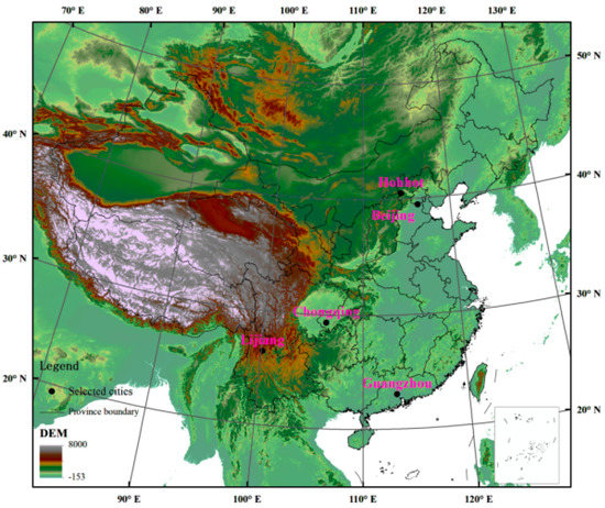 DCZ-I has excellent daylight conditions, and the annual average hourly illumination is no less than 45 klx in this zone. The annual average hourly illumination of DCZ-II is less than 45 klx and greater than 40 klx, and that of DCZ-III is less than 40 klx and greater than 35 klx. DCZ-Ⅴ has the poorest daylight conditions, with an illumination level of less than 30 klx. The daylight conditions of DCZ-IV are better than those of DCZ-V, with an annual average hourly illumination of less than 35 klx and greater than 30 klx. Based on the above context, the five selected cities are Lijiang, Hohhot, Beijing, Guangzhou, and Chongqing. In Table 1, the optimal fixed angles for the maximum annual power generation of STPVs in these five cities are calculated using the PVSYST program. The geographies and climates of the cities considered in this study are presented in Figure 1 and Figure 2.