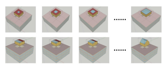 The model refers to a square room (8.4 m wide × 8.4 m long × 3.6 m high) given the economy of the column grid design. To discuss the extent to which the STPV skylight design parameters affect the energy savings potential of the space and exclude the influence of non-BIPV parameters, the representative space was placed in the middle of the top floor, with all walls being interior walls (Figure 3). During the simulation, HVAC was also working in surrounding rooms. The skylight-to-roof ratio (SRR) and inclination angle (IA) of STPVs are the primary research variables considered for flat and sloped roofs, respectively. Since the optimal IA of a PV at the study site does not exceed 45°, the SRR and IA distribution intervals range from 10% to 90% and 5° to 45°, respectively.