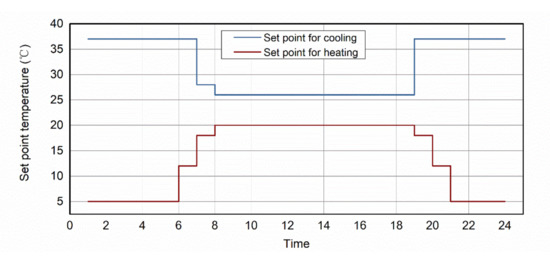The building parameters of the energy models are determined based on the “Design standard for the energy efficiency of public buildings” in China released in 2015. The air-conditioning system is assumed to work from 7:00 to 18:00 on weekdays. The thermostat action points for heating and cooling are shown in Figure 4. The floor area per capita is assumed to be 10 m2 per person.